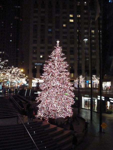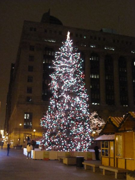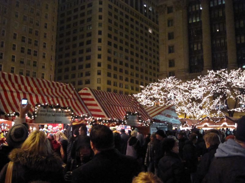 Ansonsten hab ich über ein Wochenende noch mal einen Abstecher nach Chicago gemacht und wir waren auf dem Christkindelsmarkt in Chicago. Auf diesen Christkindelsmarkt kommen deutsche Schausteller und verkaufen ihren Glühwein zu horrenden Preisen ($ 7 die Tasse). Außerdem eröffnet immer das echte Nürnberger Christkindl vom Jahr davor den Markt. Der Weihnachtsbaum ist aber typisch amerikanisch dekoriert.