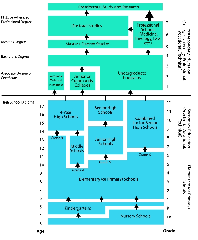 Das Bildungssystem ist vom Prinzip her einfacher strukturiert. Da jeder Staat andere „Lehrpläne“ hat, ist auch das Bildungssystem und das Niveau in jedem Staat anders.